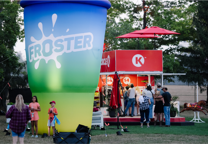 We created the Circle K Froster experience—a branded destination featuring a Froster Bar with a variety of flavours served all weekend long, a massive 24-ft Froster as a visual beacon, a Circle K gas station sign, a carousel horse photo op, a patio lounge space for guests to relax, an upper deck viewing platform offering views of the festival grounds, and branded giveaways like temporary tattoos and bucket hats. By leveraging the energy and social nature of Boots & Hearts, we sparked engagement and positioned Circle K as a brand that brings people together in fun, surprising ways. To drive trial and awareness of Frosters, we created a vibrant space where festival-goers could chill out with their friends and recharge. Bringing in recognizable elements like a larger-than-life Froster and classic Gas Station signage made the activation feel native to the environment while letting us stand out amongst other sponsor activations.