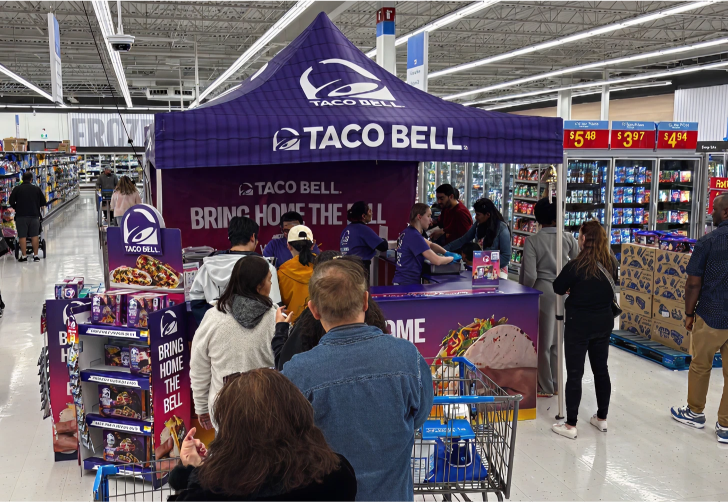 Community created a Retailtainment experience that combined sampling, education, and interactive touchpoints together. Local chefs recreated Taco Bell at-home kits live in-store, while branded napkins, serving tools, display racks, and 360° branding throughout brought the space to life. Shoppers could sample beef, chicken, and veggie tacos, and on-the-spot digital coupons encouraged follow-up purchases, connecting the in-store experience to at-home enjoyment.